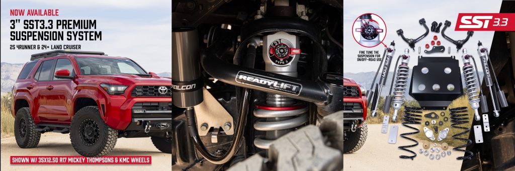For 4Runner and Land Cruiser owners who build their rigs with purpose, ReadyLIFT’s new 3″ SST3.3 Premium Suspension System (PN 62-55365) delivers the capability, control, and confidence your lifestyle demands. Designed for the 2025 4Runner (6th Gen) and 2024–2025 Land Cruiser (LC250), this system transforms your Toyota into a more capable, more composed, adventure-ready machine.